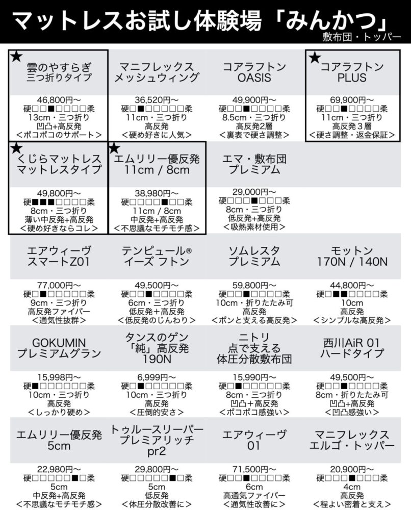 下記の製品を体験できます。どの製品を体験するか迷われた場合は、★の付いているマットレスをお選びいただくのがおすすめです。