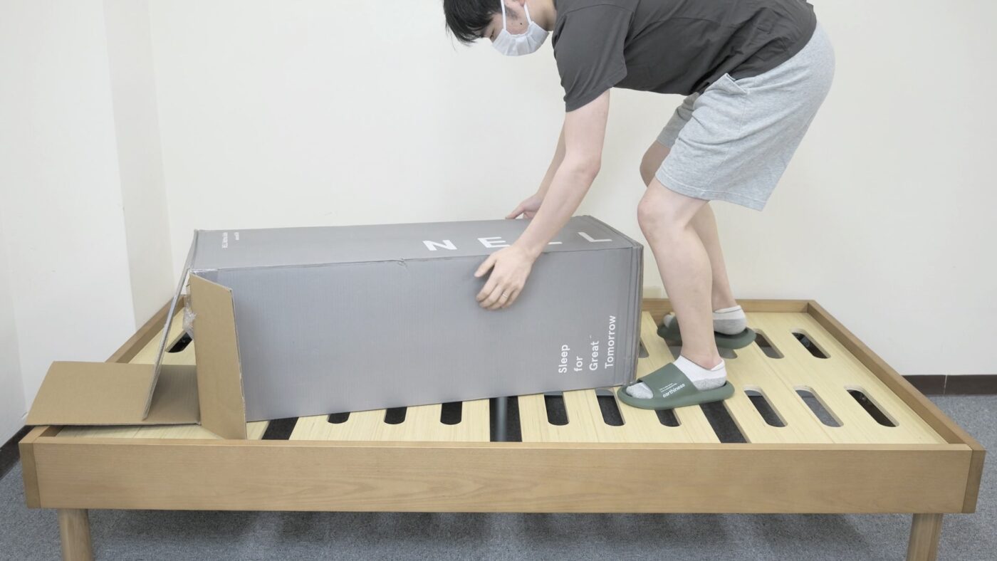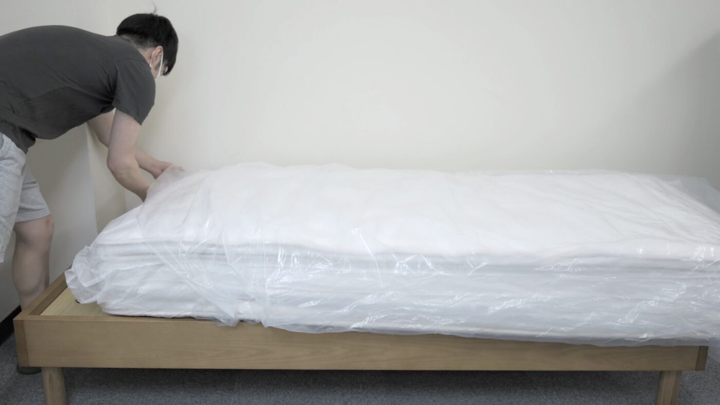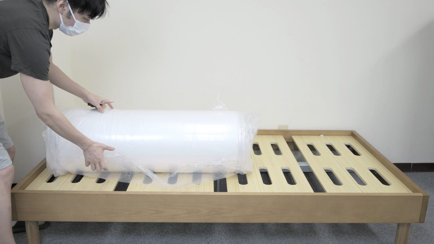 NELLマットレススイートは圧縮ロール梱包で届き、厚手の緩衝材に包まれた厳重な梱包です。