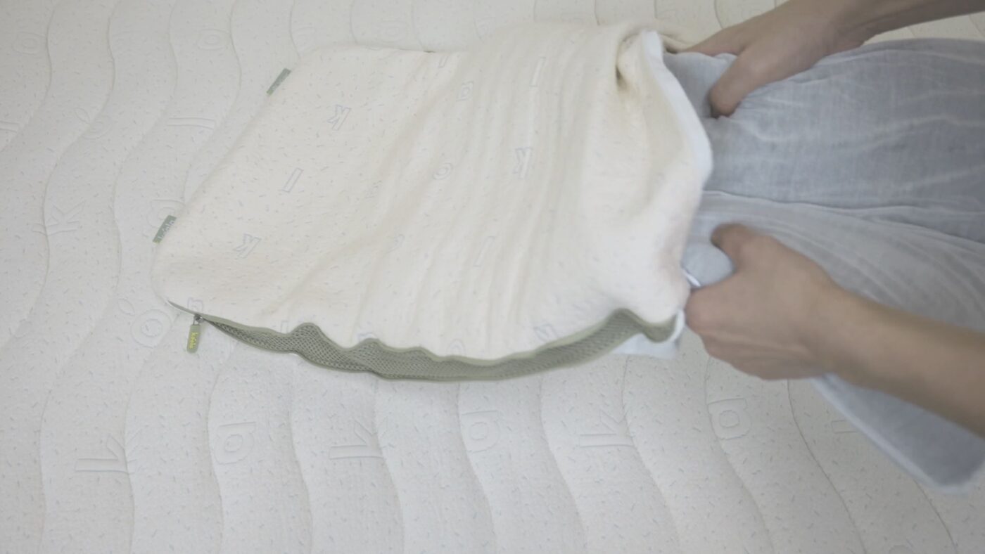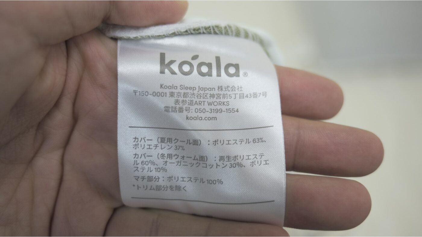 コアラピロー(2nd Gen)の中材は竹炭配合ポリウレタンフォーム100%(大豆油由来成分16%使用)です。カバー表地(夏用面)はポリエステル100%の冷感糸COOLTHREAD、裏地(冬用面)は再生ポリエステル52%、オーガニックコットン35%、ポリエステル13%の混紡生地です。カバーは取り外して洗濯機で洗えます(裏返し、ファスナー閉じ、ネット使用、弱水流、中性洗剤、陰干し)。漂白剤、乾燥機、アイロン、ドライクリーニングは不可です。枕本体(ウレタンフォーム)は水洗い不可で、汚れた場合は部分的に中性洗剤を薄めたぬるま湯で拭き取る程度にとどめます。カバーを定期的に洗い、本体は陰干しや消臭スプレーの軽い使用で清潔に保ちましょう。