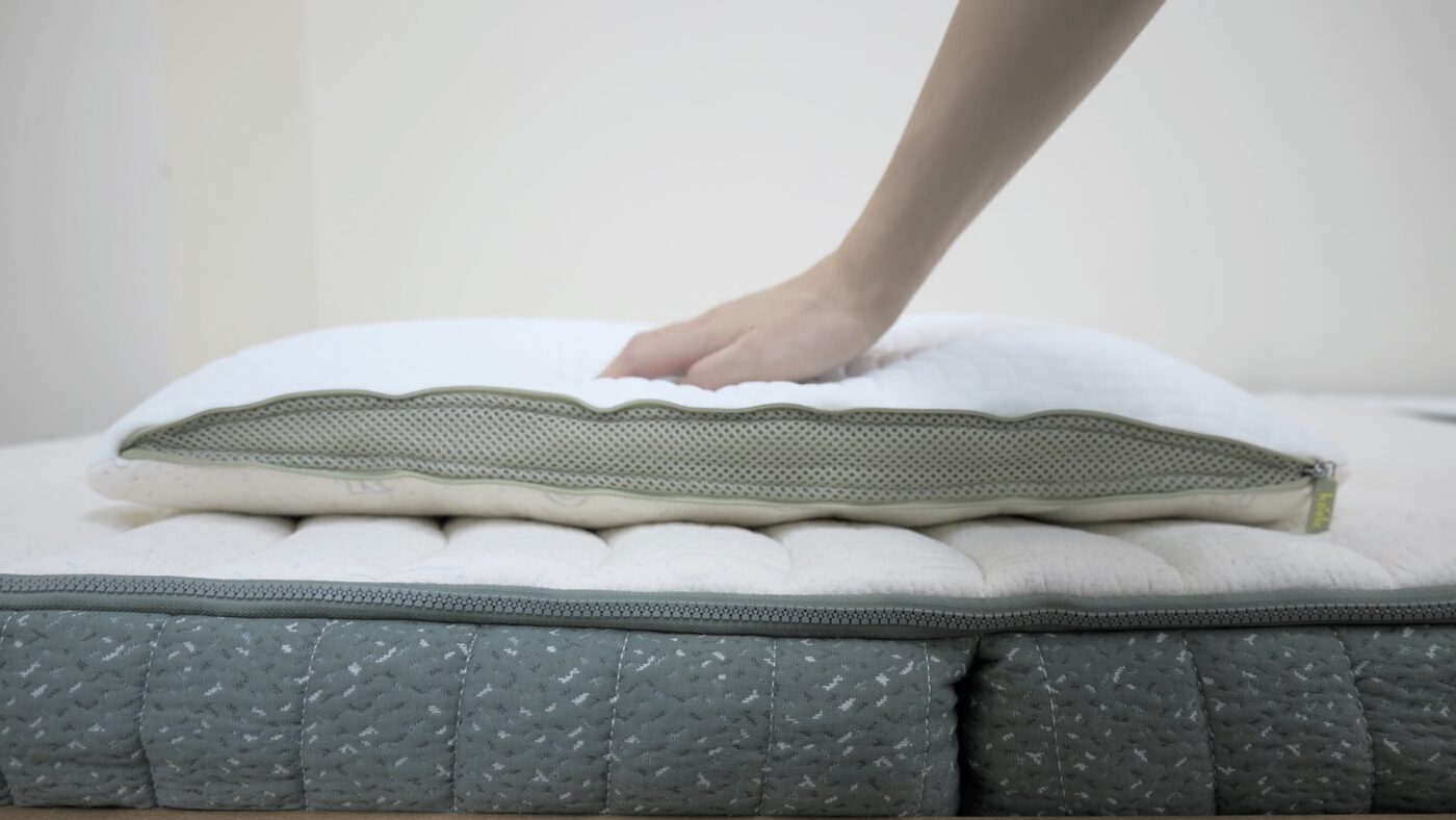 枕の感触は全体的にもちもちと柔らかく、頭を優しく包み込むようです。側面にあるファスナーの開閉で硬さを調節でき、最も柔らかい状態で使うのが気に入りました。柔らかいものの、頭をしっかり支えてくれるので安心です。