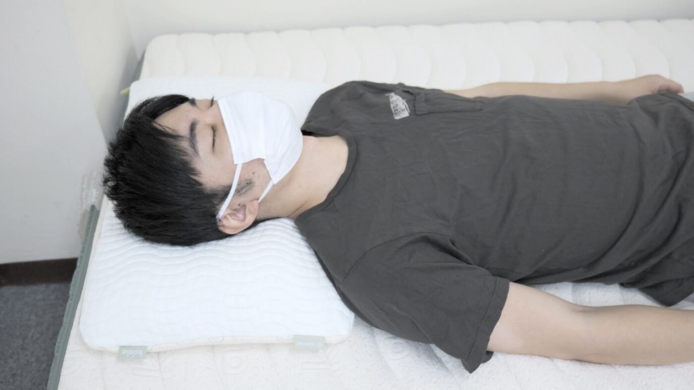 仰向けに寝ると、枕が頭から首にかけてちょうど良くフィットし、しっかり支えてくれる感覚があります。高さもちょうどよく、自然な姿勢でリラックスできます。長時間仰向けで寝ても首や頭に負担がかかりませんでした。